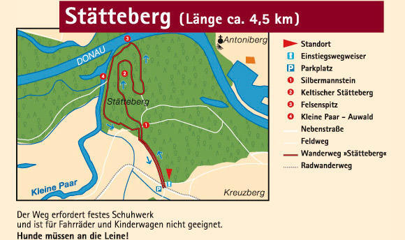 Die 4,5 km lange Wanderstrecke führt auf den 43 m über der Donau sich erhebenden Stätteberg und unterhalb seiner schroffen Abbruchkante, dem "Felsenspitz", an der Donau entlang. Aufgrund der noch gut zu sehenden Wallanlagen kann man die Ausmaße der einstigen Keltensiedlung erahnen. Sie soll nach Manching die zweitgrößte in der Region gewesen sein.